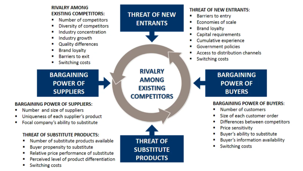Examines where power lies in a competitive situation. Identifies competition, new entrants unto the industry, supplier power, buyer power, and the threat of substitute products and services in the market.