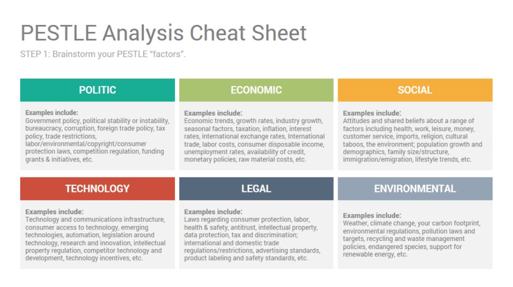 Analytical tool to assess external macro economic factors of a business. Acronym stands for Political, Economic, Social, Technological, Environmental, Legal