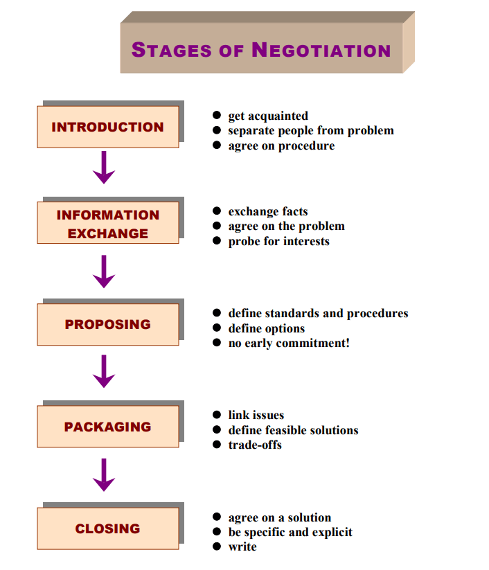 Flow chart illustrating the five stages of negotiations. Stages include introduction, information exchange, proposing, packaging and closing.