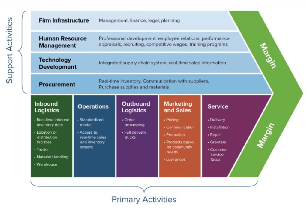 Helps break down all the activities that go into producing a good or service and understanding areas of cost savings and differentiation. A sequence of activities that each adds value to a product, service or experience. Any activity that generates more valuable outputs than the cost of its inputs can be part of a value chain.