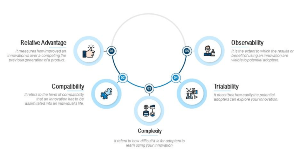 Rogers Five Factors for Innovation Diffusion and Adoption of a product: Relative Advantage, Compatibility, Complexity, Trialability, Observability. Often used in conjunction with a Product Lifecycle Analysis.