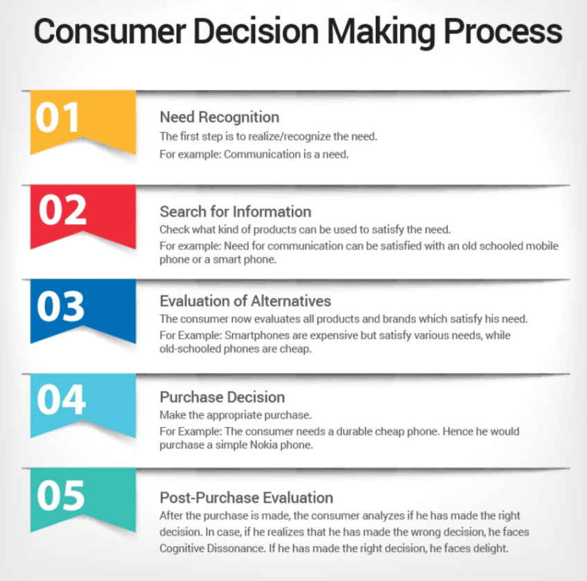 Used by marketers for identifying and tracing the decision making process of a customer from the start to the end. The process has 5 different stages: need recognition, information search, evaluation of alternatives, purchase decision, post purchase behavior.